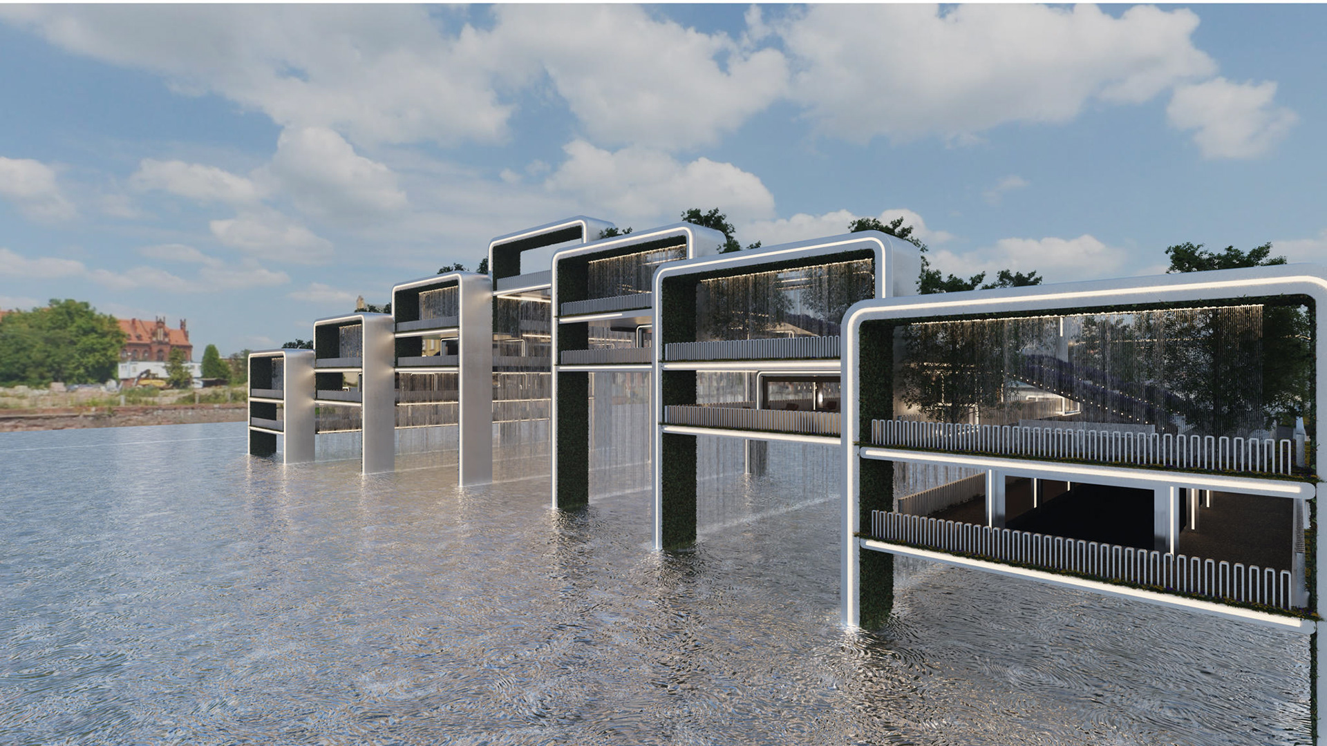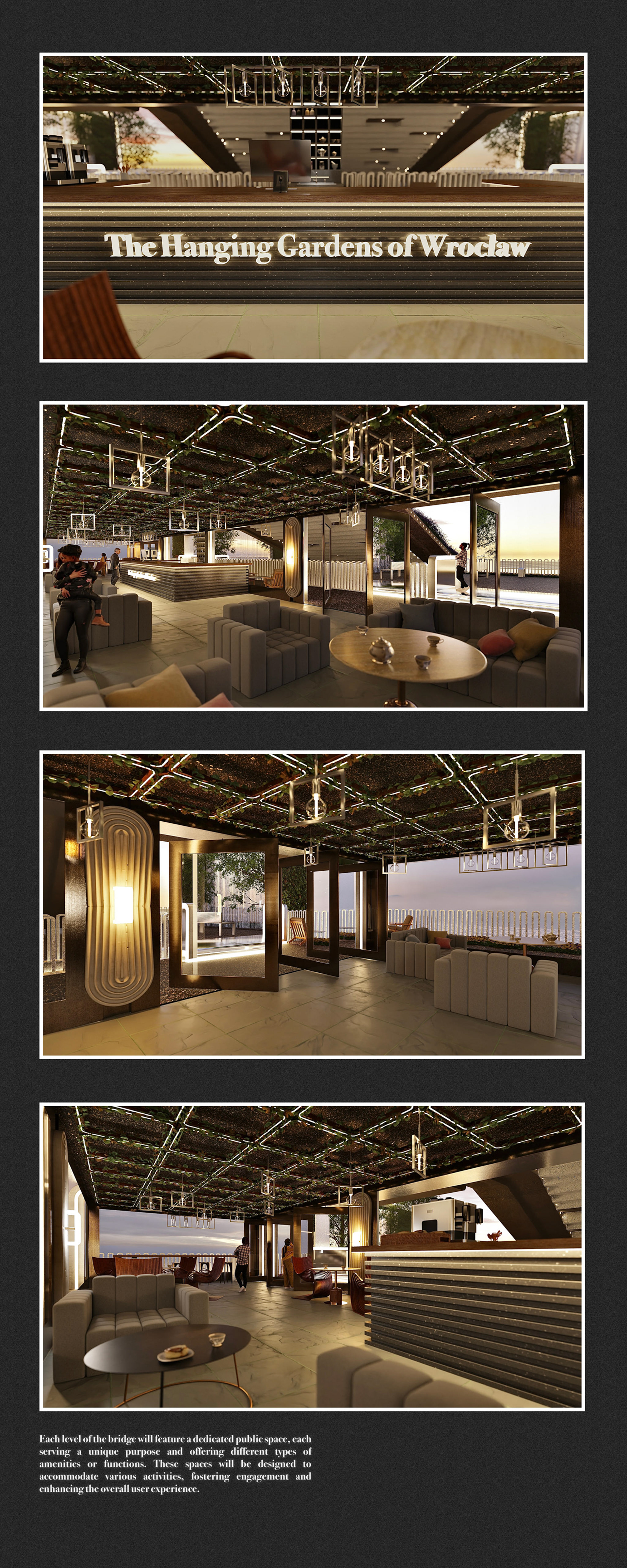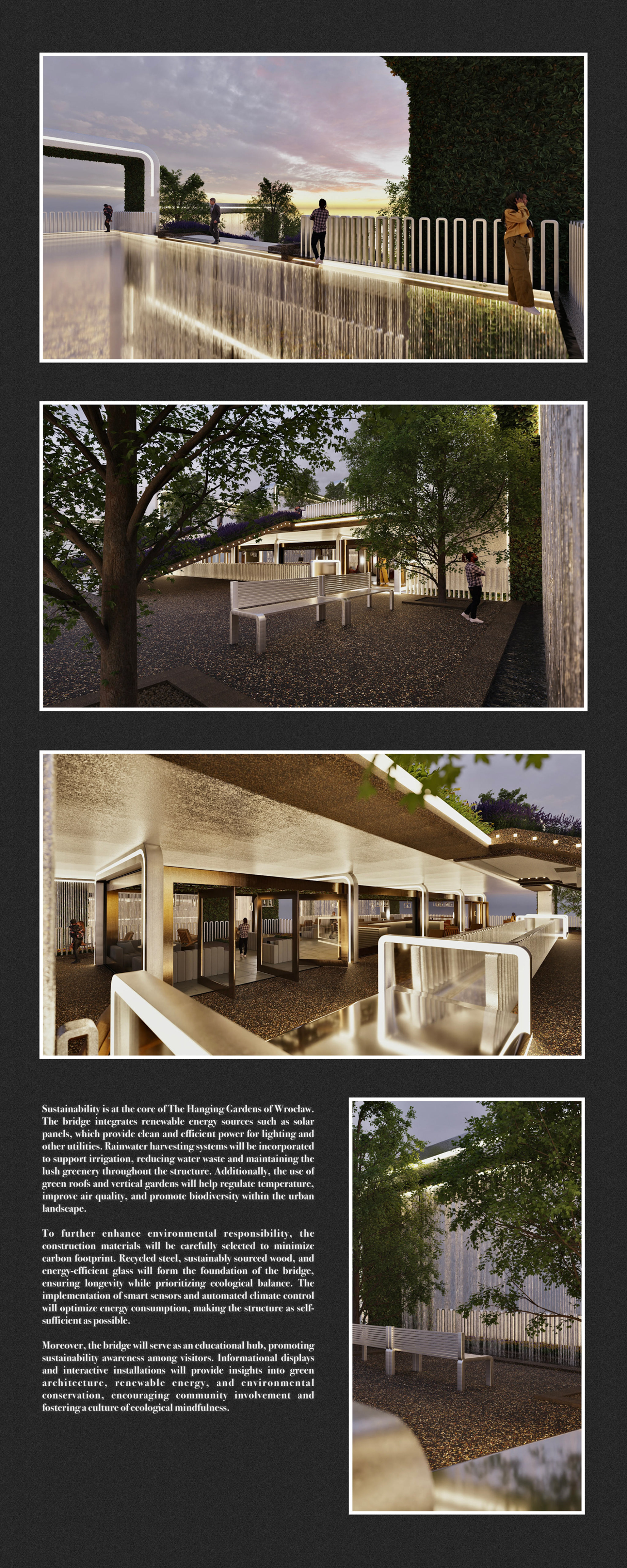 This concept reimagines Wroclaw's river landscape by creating a bridge that fuses architecture, nature, and human innovation into a living ecosystem. Inspired by the double-helix structure of DNA and the Hanging Gardens of Babylon, the design promotes community interaction while fostering connectivity and sustainability.
